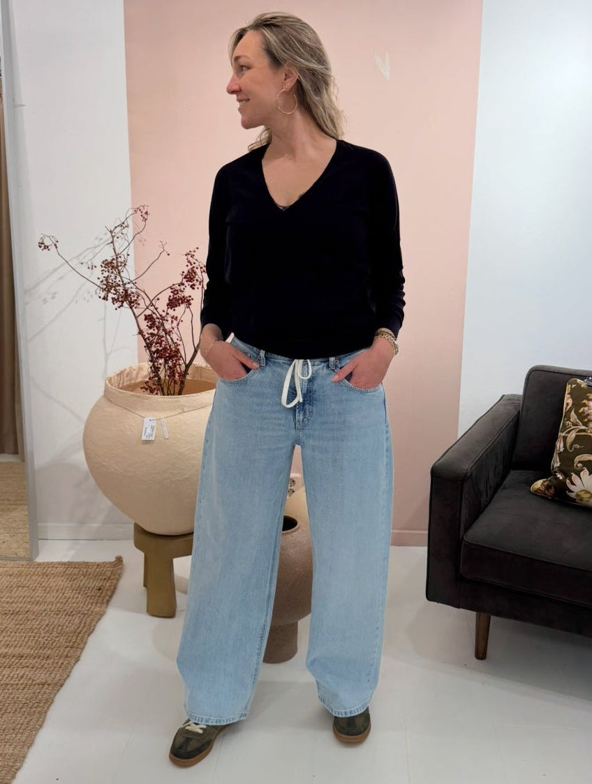 De baggy jeans van Cambio in een lichte wassing, de "baggy sun bleach" jeans kan met en zonder koord gedragen worden.
