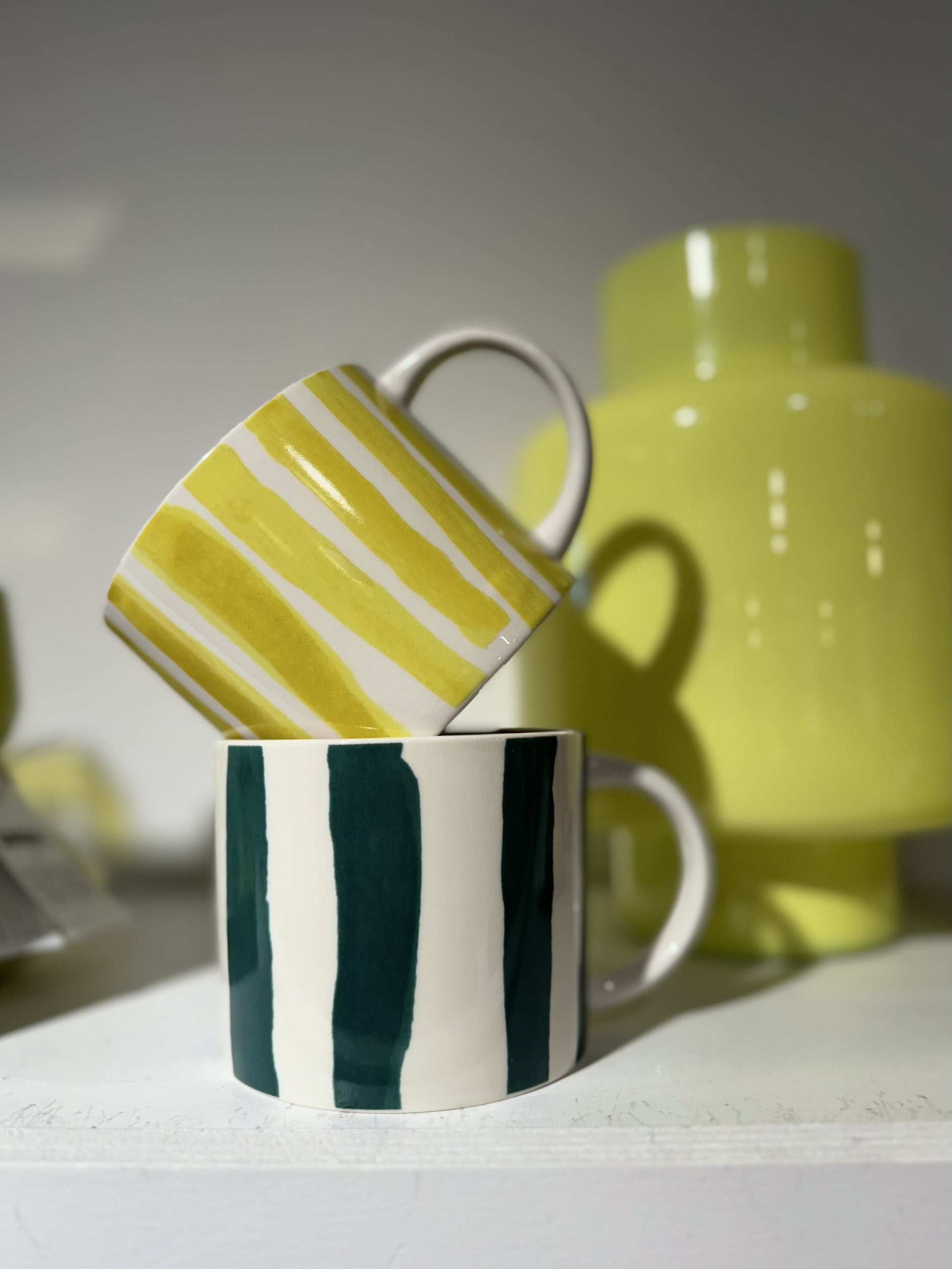 Deze unieke mok valt op door zijn handgeschilderde, levendige strepen en de speelse kleurencombinatie, er zijn drie verschillende combinaties te verkrijgen. Een vrolijke toevoeging aan je servies, perfect om je dag mee te beginnen of juist af te sluiten.