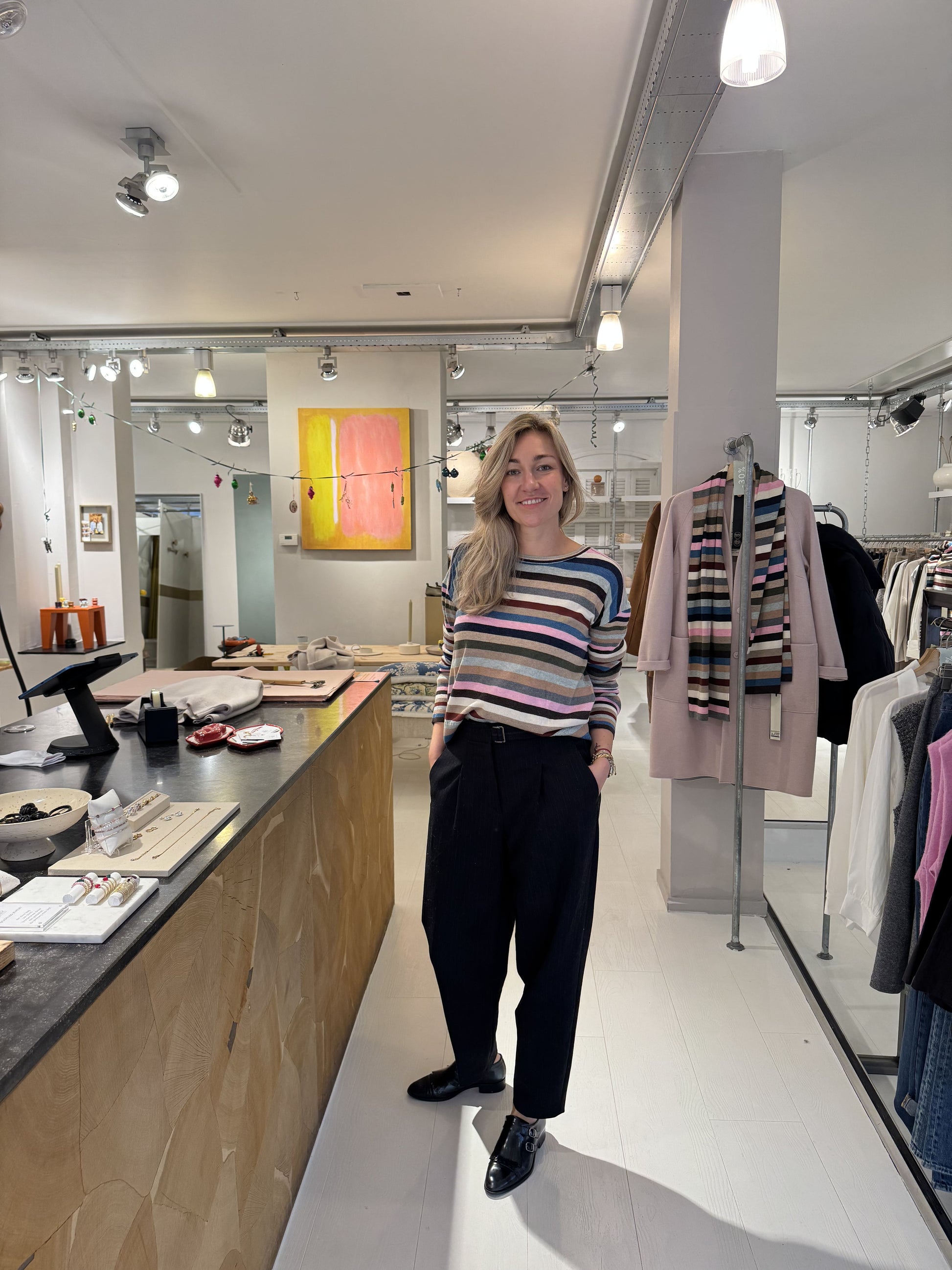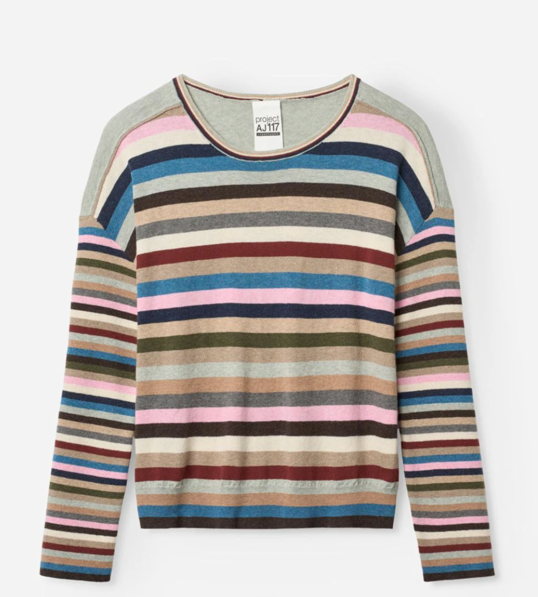 Safir multi is een gestreepte trui met veel verschillende kleuren. De samenstelling van de stof is 70% organisch katoen, 30% extra fijne wol.